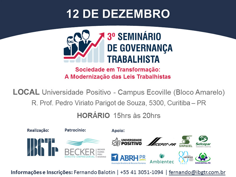Convidamos você para o 3º Seminário de Governança Trabalhista do Instituto Brasileiro de Governança Trabalhista- IBGTr, no qual estamos como apoiadores. O foco do evento será "Sociedade em Transformação - A Modernização das Leis Trabalhistas". Para falar sobre este tema contaremos com a presença dos seguintes palestrantes: - Sylvia Lorena, Gerente Executiva de Relações do Trabalho da Confederação Nacional da Indústria (CNI); - Cassio Colombo Filho, Magistrado e Desembargador no Tribunal Regional do Trabalho da Nona Região, professor universitário, escritor e palestrante; - Bruno Martin, People & Culture da NUBANK; - Jean-Baptiste Cordon, CEO da Jasmine Alimentos; - Rodolfo Tornesi, Gerente de RH da Jasmine Alimentos; - André Caldeira, CEO da Proposito/TRANSEARCH; - Painel ABRH-PR, com Yonder Kou, Diretor do Espaço de Desenvolvimento. Data: 12 de dezembro. Horário: 15h às 20h. Local: Universidade Positivo – Campus Ecoville (Bloco Amarelo) – R. Prof. Pedro Viriato Parigot de Souza, 5300 – Cidade Industrial, Curitiba – PR. VALORES: Associado: R$60,00* (Valor válido para associados: IBGTr, ABRH-PR, ABIMAQ, SINPACEL, SETCEPAR, SINDIMETAL e/ou SICEPOT) Não sócio: R$120,00*