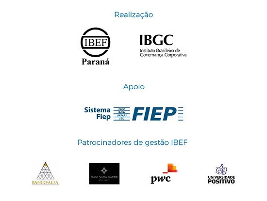 As boas práticas de Finanças e Governança Corporativa contribuem para a gestão estratégica e o crescimento sustentável de empresas de todos os portes. O IBEF e o IBGC, como pioneiros nesses temas, apresentam neste evento palestrantes que são referências nacionais. Data: 19/Março Horário: 08h às 17h30 Local: FIEP - Federação das Indústrias do Estado do Paraná Endereço: Av. Cândido de Abreu, 200 - Centro Cívico - Curitiba /PR DESCONTOS PARA SINDICATOS Como forma de valorizar os sindicatos associados, a Fiep oferece valores especiais para esse público. CONFIRA: Organizações parceiras*: - Até 28/02: R$ 225,00 - Até 18/03: R$ 300,00 *Valores indicados incluem almoço e coffee. Estacionamento por conta do participante. FAÇA JÁ A SUA INSCRIÇÃO! Secretaria de inscrições: (41) 99872-0203 / ana@ibefpr.com.br / www.ibefpr.com.br.
