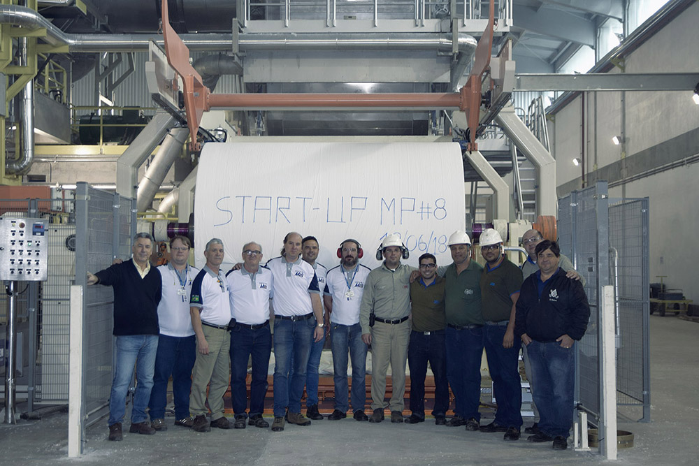 No dia 19 de junho de 2018 a MP8 da Mili produziu sua primeira bobina. Foi um start up muito bem-sucedido, com a máquina desde o princípio produzindo papel de excelente qualidade. A máquina iniciou com velocidade de 1000 m/mim e rapidamente foi aumentando seu desempenho, sendo que em alguns dias já operava com velocidade de 1900 m/min. O sucesso do start up se deve ao grande esforço concentrado tanto por parte da Mili como da Hergen, desde o projeto até as etapas de montagem, comissionamento e ajustes. Todo esse esforço resultou numa instalação primorosa, dentro dos altos padrões de qualidade exigidos pela Mili e que a Hergen faz questão de fornecer.Dados DADOS: Tipo papel: higiênico e toalha (15 a 28 g/m²) Produção: Toalha: 140 t/d @ 100% ef. Folha simples: 120 t/d @ 100% ef. Largura da folha na enroladeira: 2760mm Velocidade de projeto: 2200 m/min Legenda foto: Orides (Hergen), Rafael (Hergen), Carlos (Mili), Anderson (Mili), Paulo (Mili), Sérgio (Hergen), Sidnei (Hergen), Augusto (Mili), Murilo, Gerson (Mili), Hebert, Henrique, José. ... Para informações de compra, CLIQUE AQUI