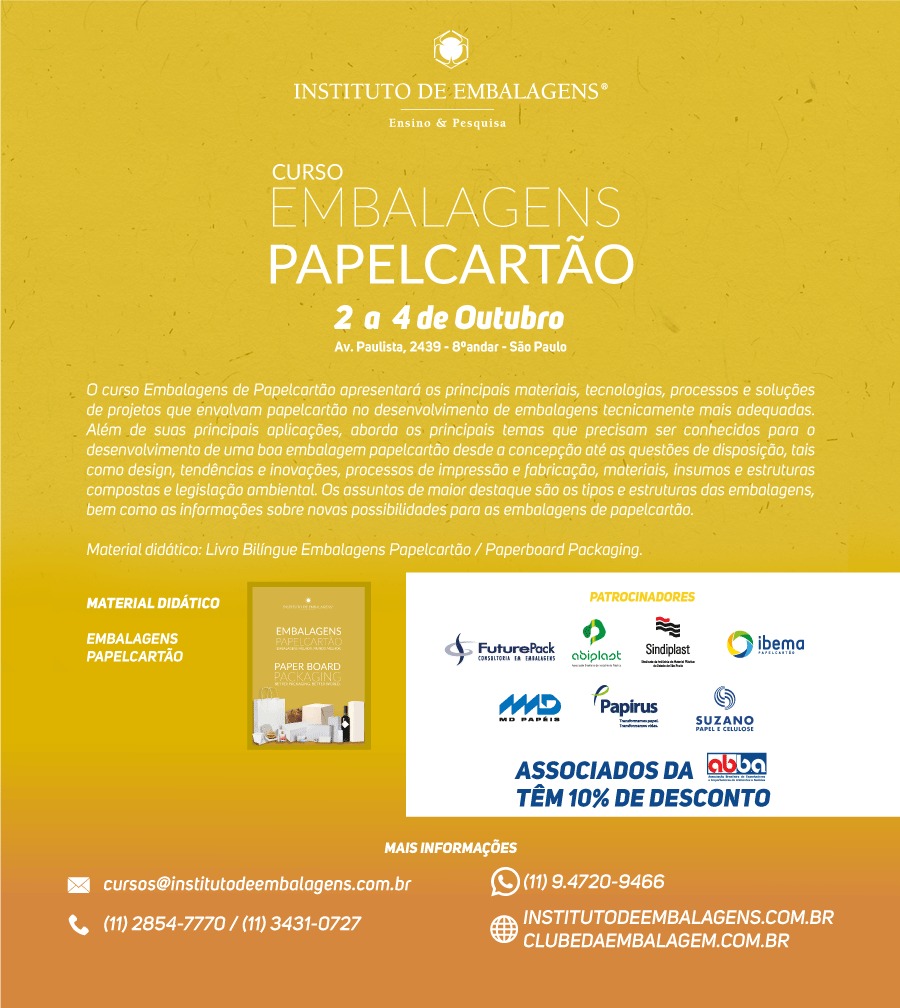 Data: 02 a 04 de Outubro Local: Av. Paulista, 2439 - 8ª Andar - São Paulo O curso Embalagens de Papelcartão apresentará os principais materiais, tecnologias, processos e soluções de projetos que envolvam papelcartão no desenvolvimento de embalagens tecnicamente mais adequados. Além de suas principais aplicações, aborda os principais temas que precisam ser conhecidos para o desenvolvimento de uma boa embalagem papelcartão, desde a concepção até as questões de disposição, tais como design, tendências e inovações, processos de impressão e fabricação, materiais, insumos, estruturas compostas e legislação ambiental. Os assuntos de maior destaque são os tipos e estruturas das embalagens, bem como as informações sobre novas possibilidades para embalagens de papelcartão. Material didático: Livro Bilingue Embalagens Papelcartão / Paperboard Packaging MAIS INFORMAÇÕES: - E-mail: cursos@institutodeembalagens.com.br - Fone: (11) 2854-7770 / 3431-0727 - WhatsApp: (11) 94720-9466 - Website: institutodeembalagens.com.br / clubedaembalagem.com.br