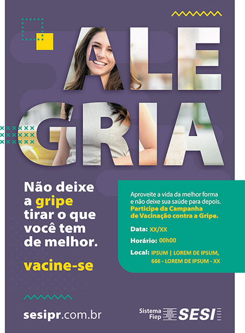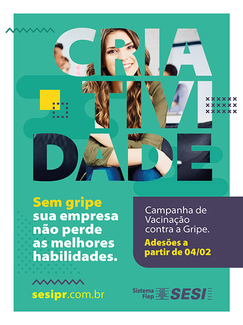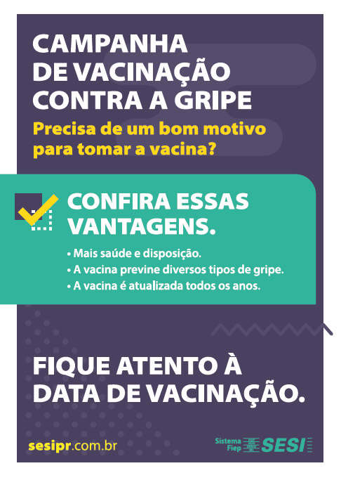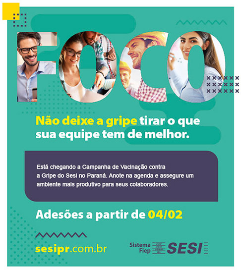 O Sesi lança a Campanha da Vacinação Contra a Gripe 2019, tendo como foco o atendimento à indústria paranaense e o fomento ao associativismo sindical, conforme segue: Serviço de imunização a saúde trabalhador: Contempla a aplicação de uma dose da vacina contra a gripe no trabalhador; Público Alvo: Campanha destinada para o trabalhador da indústria, não extensiva para seus familiares; Preços e descontos: *Sindicatos e/ou empresas associadas aos sindicatos empresariais filiados à Fiep - Preço dose da vacina (trivalente): R$ 29,00 - Preço dose da vacina (quadrivalente): R$ 37,00 CNAE Indústria ou Empresas Contribuintes (não associadas aos sindicatos patronais filiados à Fiep) - Preço dose da vacina (trivalente): R$ 41,00 - Preço dose da vacina (quadrivalente): R$ 49,00 CNAE não Indústria - Preço dose da vacina (trivalente): R$ 59,00 - Preço dose da vacina (quadrivalente): R$ 69,00 *Importante: Preços praticados para sindicatos e/ou empresas associadas a estes, NÃO poderão ser praticados para outros públicos. Desta forma, todos os contratos de empresas associadas deverão ter a confirmação da associação via e-mail do sindicato. Atenção: Para fins de cobrança no ano de 2019, será considerado o número de doses solicitadas por meio do Termo de Adesão, o qual tem validade jurídica; Datas: Período de adesão: 04/02/2019 à 01/03/2019 Gesto vacinal: abril à junho de 2019. Contatos e mais informações: Detalhes técnicos sobre a operacionalização da campanha: Rosangela Lenhatovivicz – e-mail: rosangela.lenhatovicz@sistemafiep.org.br ou adesaovacina@sistemafiep.org.br / fone: 41 3271-9851. Detalhes comerciais devem ser consultados diretamente o colaborador Jorge Luiz Felippe – e-mail: jorge.felippe@sistemafiep.org.br / fone 41 3271-9221. Materiais de campanha: